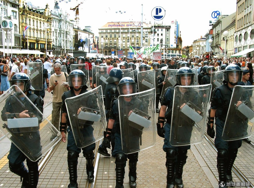 照片中是 2002年的克羅埃西亞同志大遊行,眾多的警察站在遊行隊伍的前方保護參加遊行的人。
