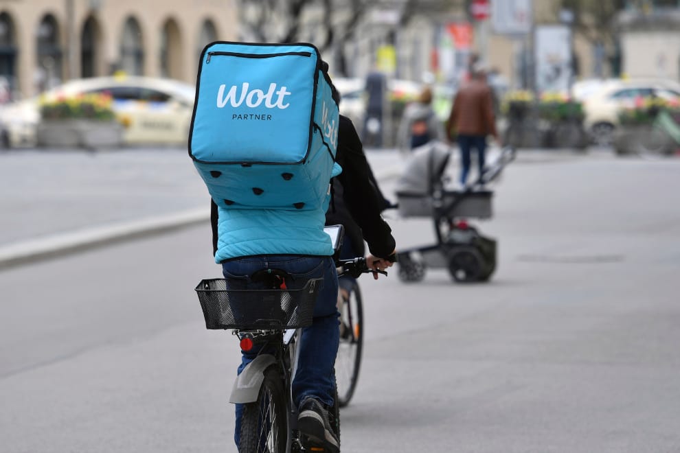 倘若在封城期間依然需要外送服務,制定好清楚的清潔、消毒步驟,才能有效避免病毒趁隙而入。圖為德國慕尼黑一名騎著腳踏車的外送員。