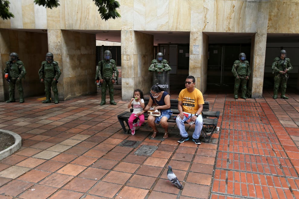 在卡利的下城區,一個小家庭正坐在長椅上休息,四周都是鎮守當地的士兵,攝於 5月29日。