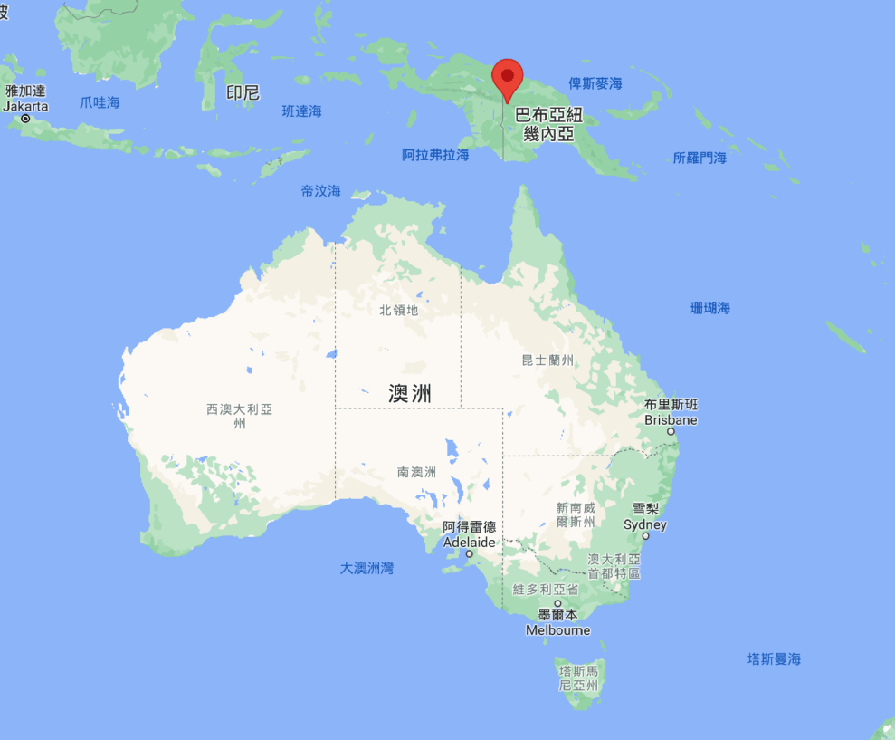 圖為澳洲與新幾內亞島的相對位置,紅標處即為新幾內亞島,而圖中的巴布亞紐幾內亞則是新幾內亞島東半部的一個國家。
