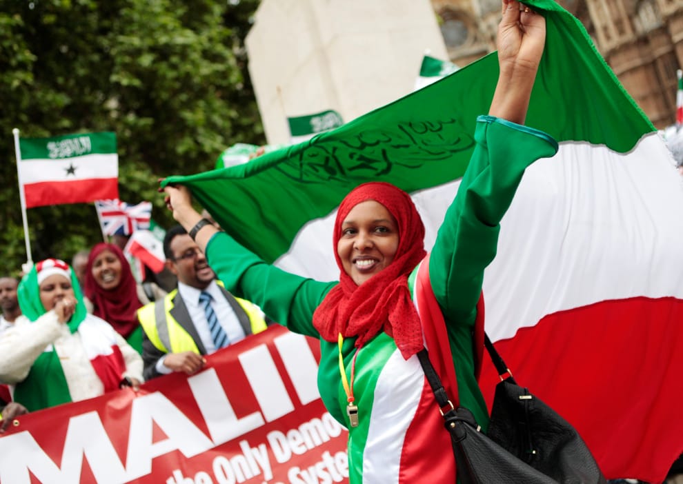 本照攝於 2011年5月18日,為索馬利蘭獨立 20周年。畫面中,一名索馬利蘭女子正在英國倫敦的遊行活動中揮舞旗幟、慶祝自己國家的生日。
