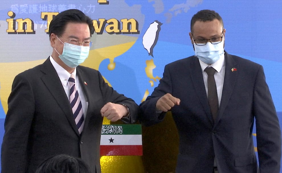 歐新社 / 達志影像同樣來自 2020年9月9日的索馬利蘭共和國代表處揭幕儀式,索馬利蘭大使哈吉(Mohamed Hagi,右)與外交部長吳釗燮在鏡頭前擊肘合照。