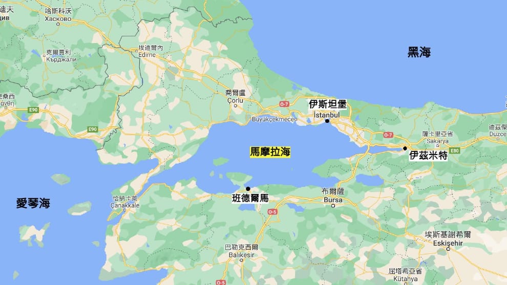 馬摩拉海介於黑海與愛琴海之間,是土耳其的內海,地圖中標示出的白底地點伊斯坦堡、班德爾馬和伊茲米特都是這次受「海鼻涕」影響的城市。
