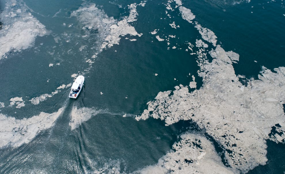 從空拍的角度可以清楚看到淺褐色的海鼻涕和底下的藍綠色海水。攝於博斯坦斯港,5月31日。