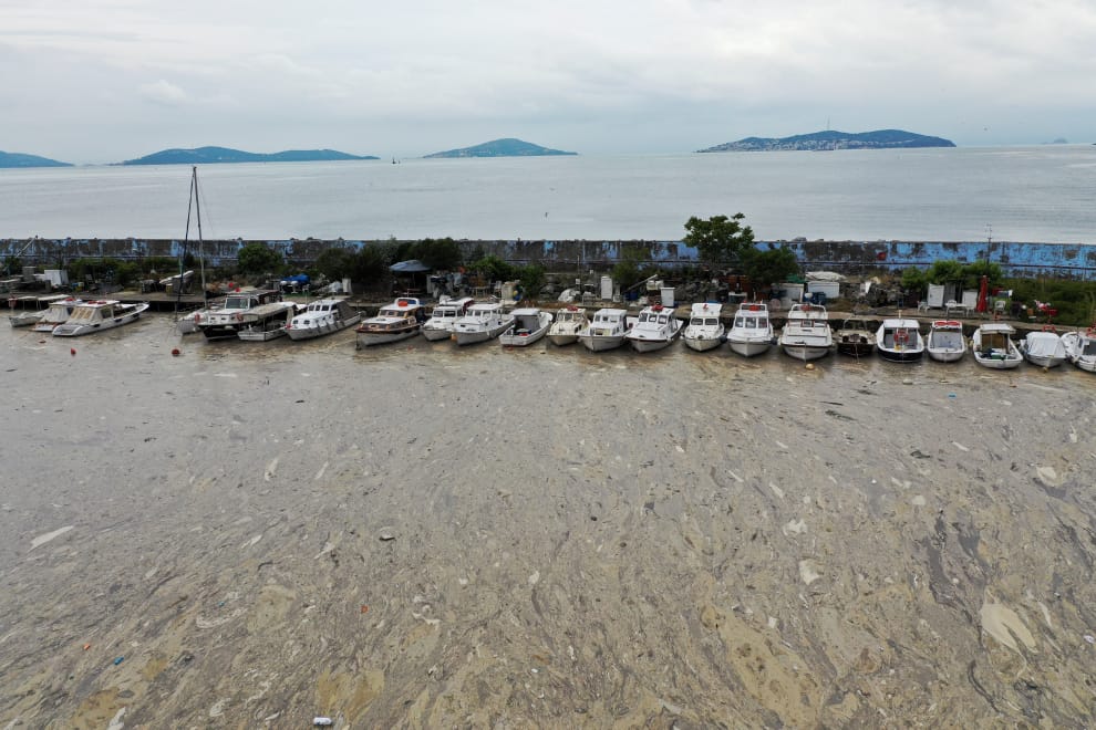 在土耳其,內海「馬摩拉海」(Sea of Marmara)的漁民在最近碰上了一個大麻煩:他們無法捕魚,因為一種俗稱「海鼻涕」(sea snot,又稱「marine mucilage」,即「海洋黏液」)的厚重黏稠物質在沿岸大量漂流、覆蓋了海面,不僅黏住他們的漁網,也讓人擔心起水裡的魚到底能不能食用。
