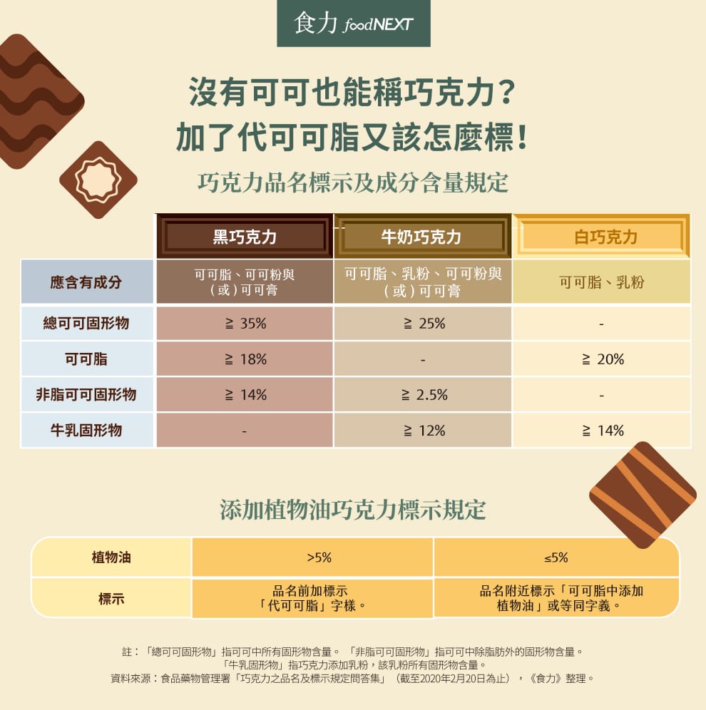 黑巧克力、白巧克力或牛奶巧克力的差異可不僅是顏色和口味而已。過去台灣針對這3種主要的巧克力標示並沒有明確的定義與規範,讓市售產品的規格混亂,消費者難以辨別,直到2017年1月1日,食品藥物管理署訂定的「巧克力之品名及標示規定」正式上路,針對不含內餡及其他配料(如堅果、餅乾等)的固體巧克力進行管理,就此巧克力的管理便於法有據。