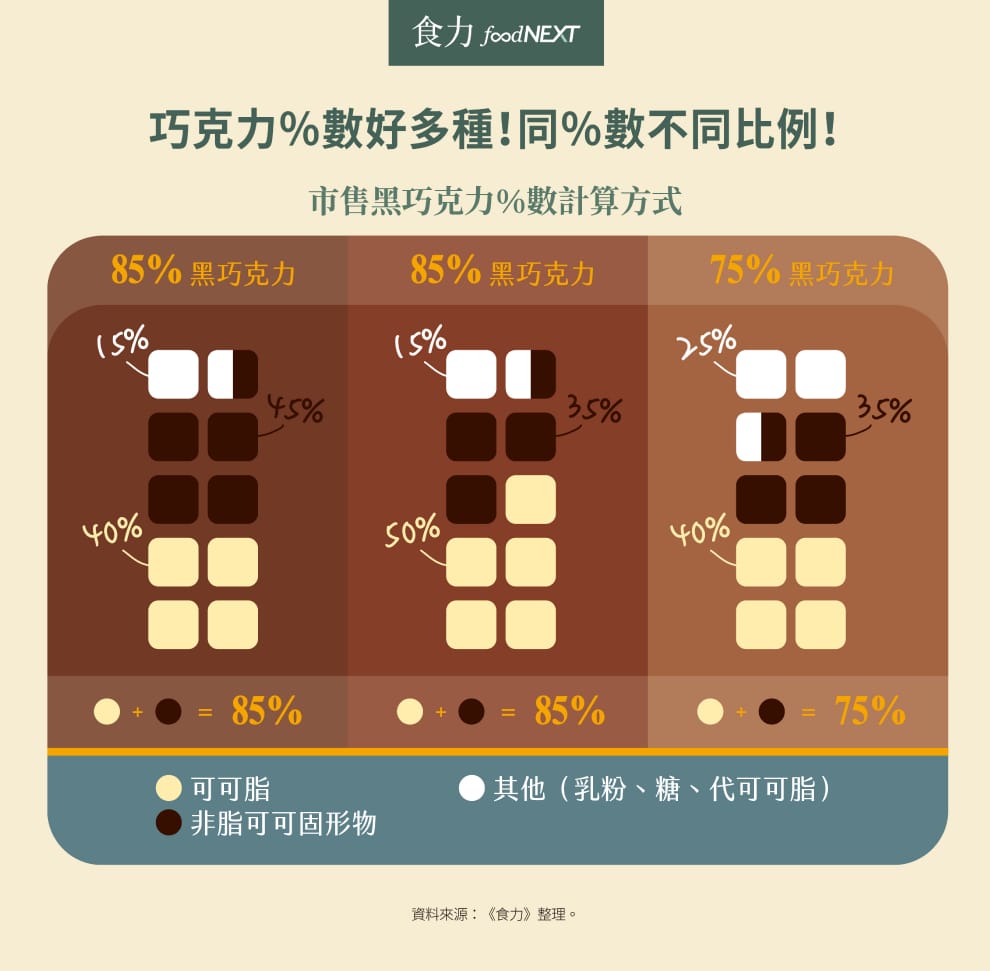 85%與75%的黑巧克力儘管含有可可%數不同,但實際上每100公克中所含有的可可脂含量也可能一樣高。