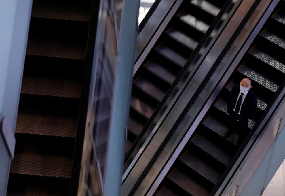 田島隆太郎正站在一棟商業大樓內的電扶梯上頭,他指出身邊的人都反對東京奧運。