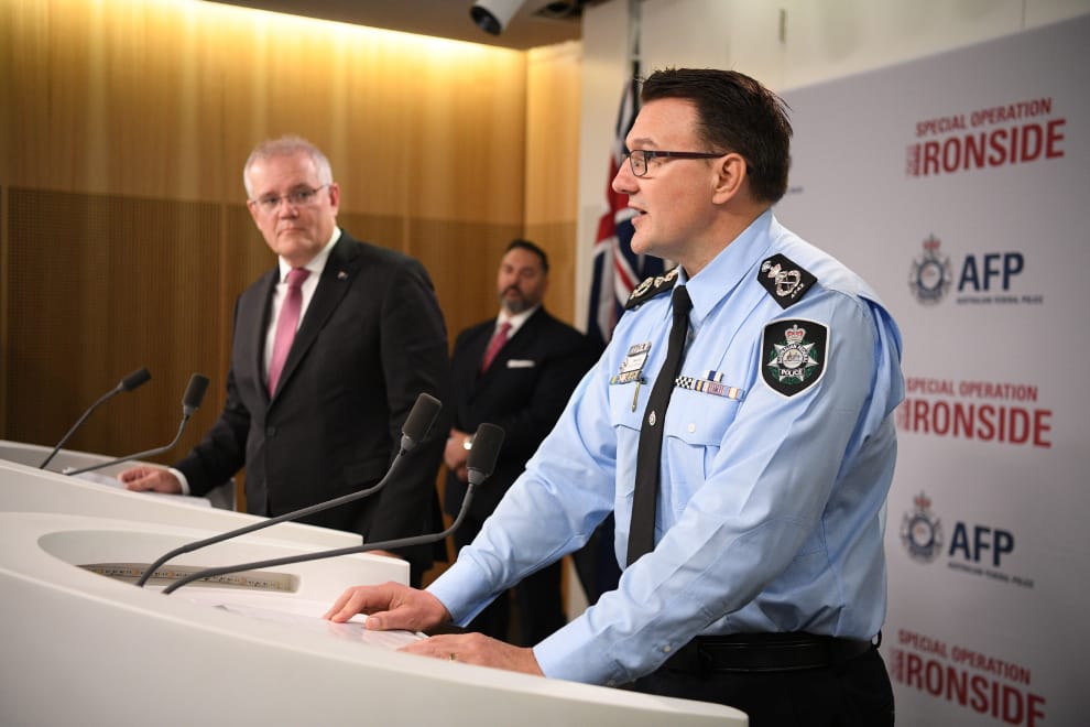 本月 8號,澳洲聯邦警察也於雪梨舉辦了記者會,公布「鐵邊行動」的成果。畫面中正在發表談話的是澳洲聯邦警察局長克蕭,圖左則是澳洲總理莫里森。