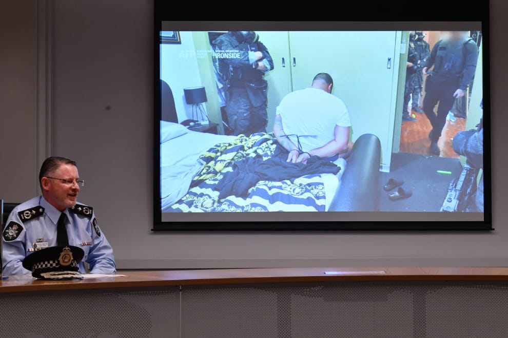 澳洲聯邦警察副局長萊恩(Nigel Ryan)在記者會上進行成果簡報,投影幕上顯示的是逮捕罪犯的影像紀錄。