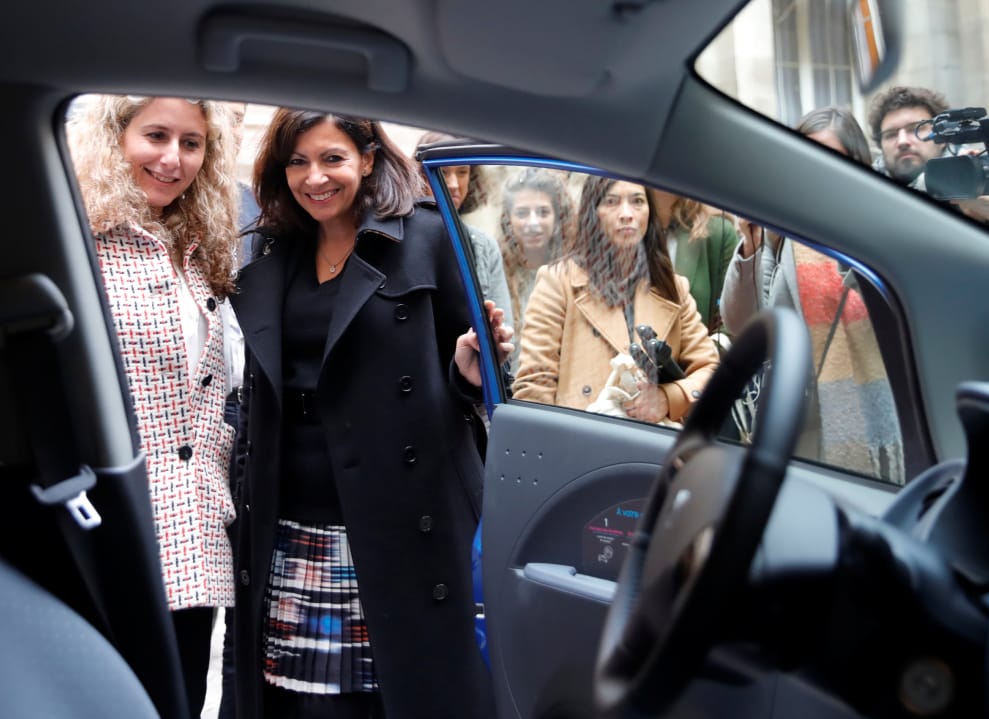 巴黎市長伊達爾戈(Anne Hidalgo,圖右)和寶獅雪鐵龍集團移動和連接服務部門(Mobility and Connectivity Services)執行副總裁庫爾特烏(Brigitte Courtehoux,圖左)正在一同參觀提供「Free2Move」服務的電動車內裝,照片攝於 2018年11月。