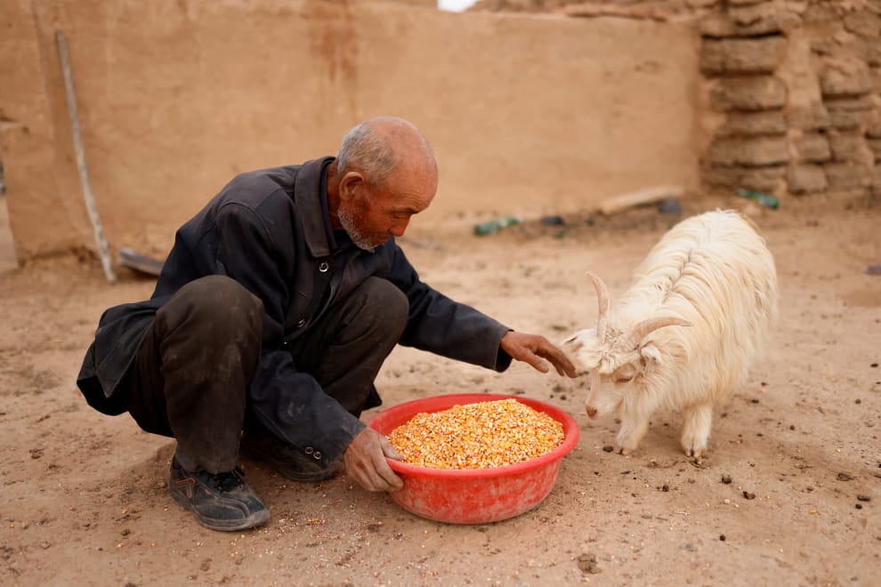 在植樹計畫開跑這麼多年後,住在甘肅省民勤縣的牧民李友福並不認為這項政策有發揮當初預想中成果。圖中的李友福正在努力避免家裡的羊,靠近他手上拿著的一盆玉米粒。