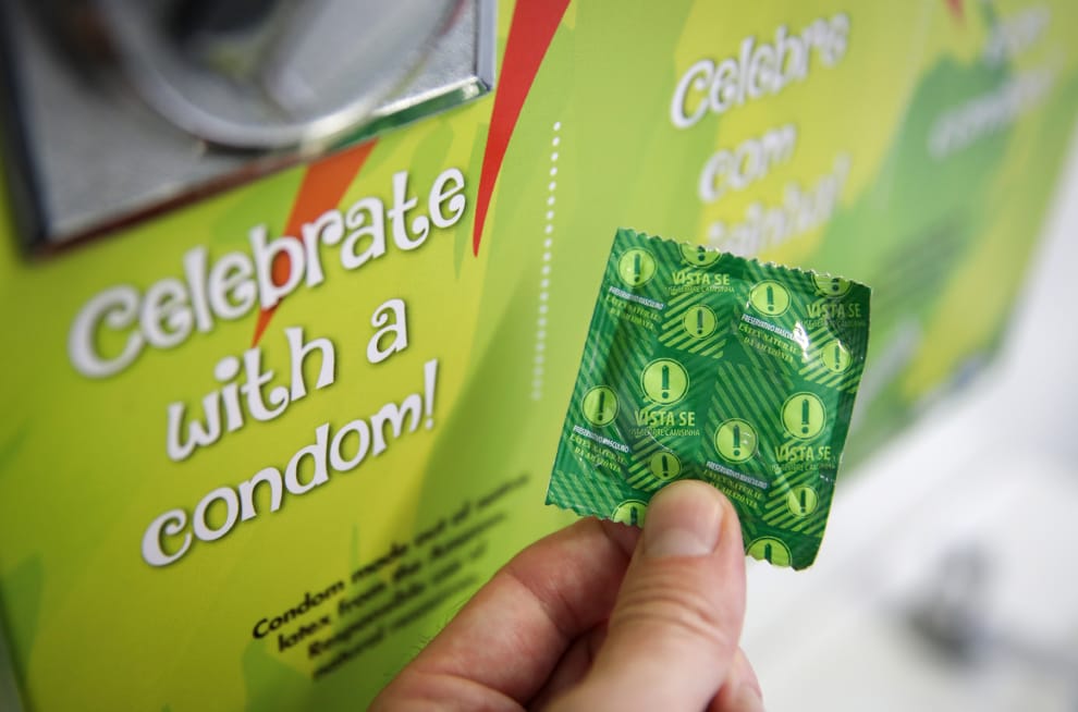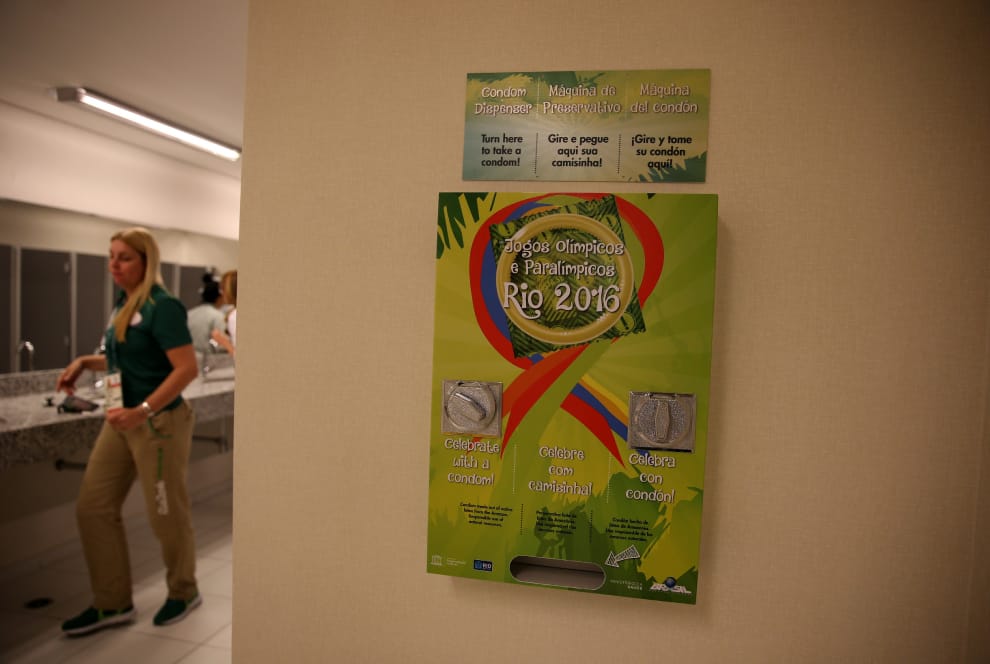 從 1988年的漢城奧運以後,奧運開始有了在賽事期間提供免費保險套的慣例。圖為 2016年里約奧運期間,設於女性洗手間外的一台保險套發放機。