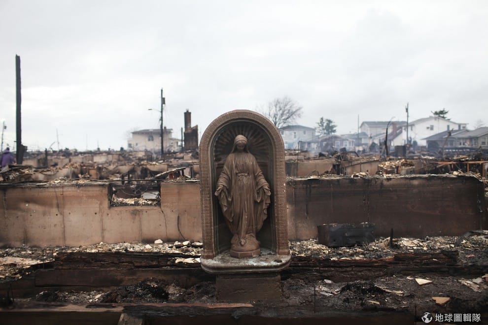 紐約皇后區一處房子,因颶風引起的火災被燒毀,只剩下一尊聖母瑪利亞的雕像在原地。圖片來源:Spencer Platt/Getty Images