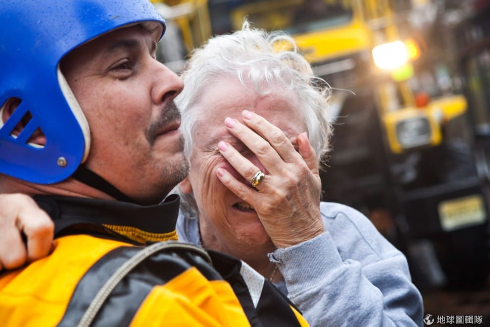 紐澤西當地的一名老奶奶,被救難人員救出時,一想到失去家園忍不住痛哭。圖片來源:Andrew Burton/Getty Images