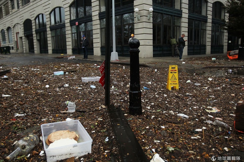 颶風平息後的布魯克林街區上,充滿雜物垃圾,需要等待辛苦的清掃人員清洗後才能復原。圖片來源: Spencer Platt/Getty Images
