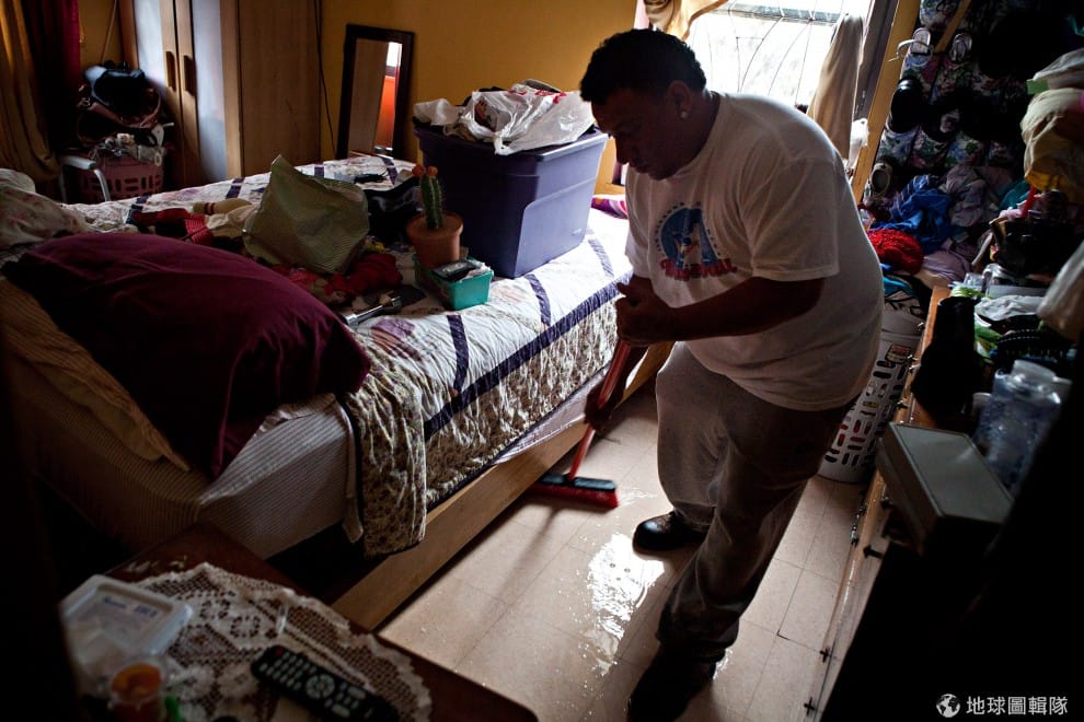 大水淹進房子裡面,沙發衣物全泡水,居民也只能開始掃水清理家園。圖片來源:Andrew Burton/Getty Images