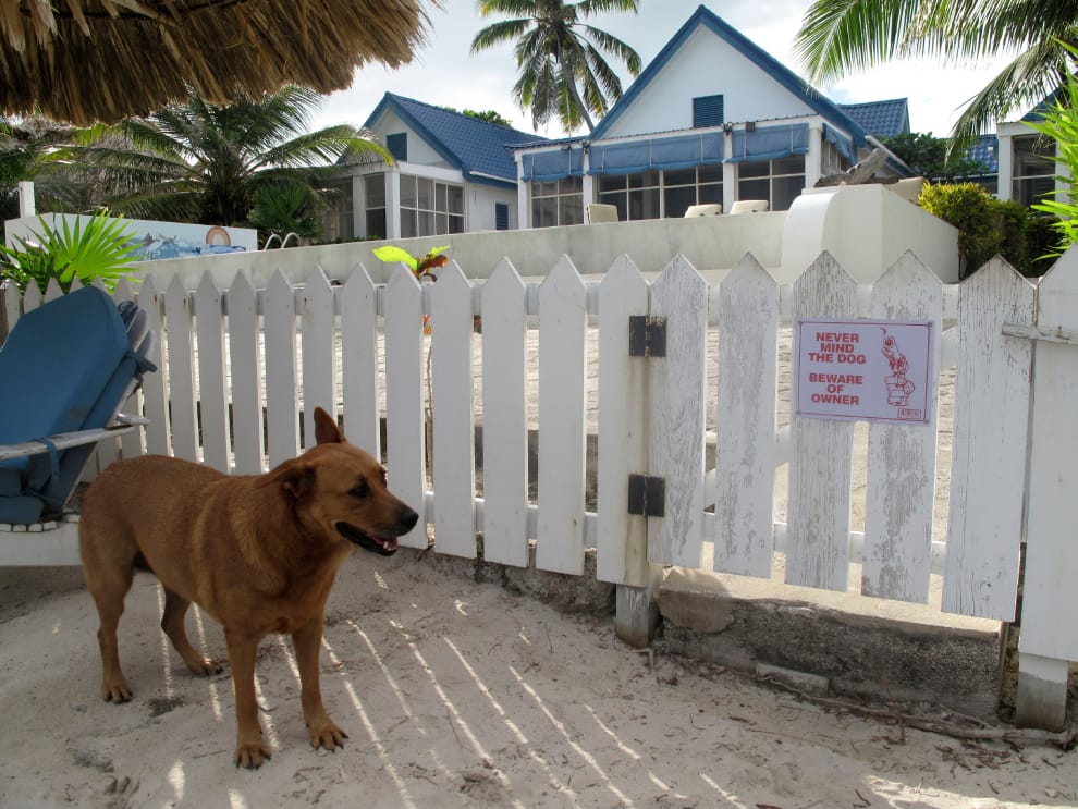 圖為麥克菲在貝里斯的住家,這裡也是他的樂園,除了有多名女子入住外,他也養了大狗來作伴,圍籬上的告示牌則寫著「別介意狗,要注意的是主人」,並且附上了一張單手持槍的圖片。