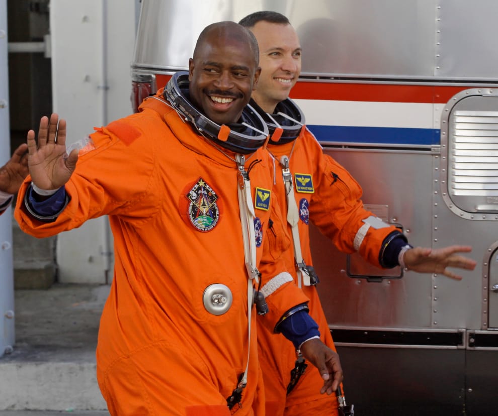 本次洗衣計畫發言人的梅爾文指出,太空人的衣物往往只要一周就得換掉並扔掉。本照攝於 2009年11月16日,梅爾文(圖左)正從美國佛州卡納維爾角( Cape Canaveral)的甘迺迪太空中心(Kennedy Space Center)離開,準備搭車到附近的火箭發射台,並前往國際太空站執行任務。