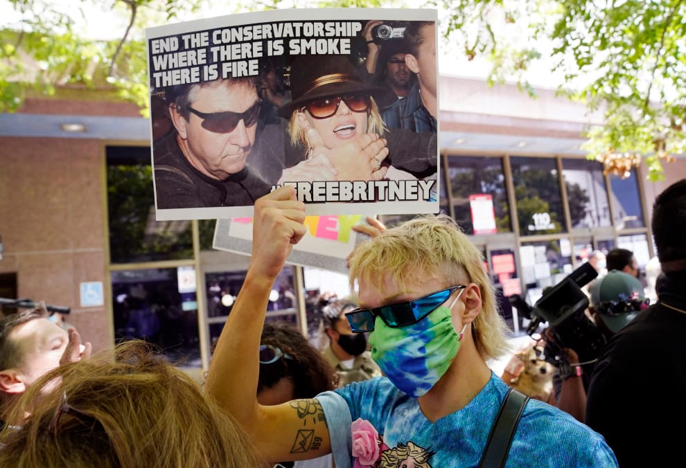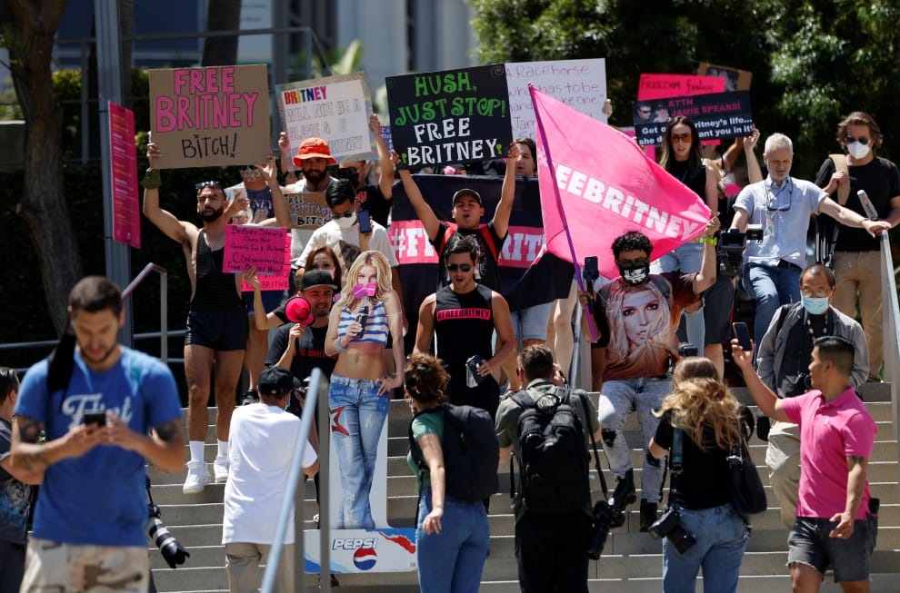 在開庭當天,布蘭妮的支持者帶著寫上「放布蘭妮自由」(Free Britney)的標語、旗幟,以及布蘭妮的人形看板,來到法院外頭聲援她。