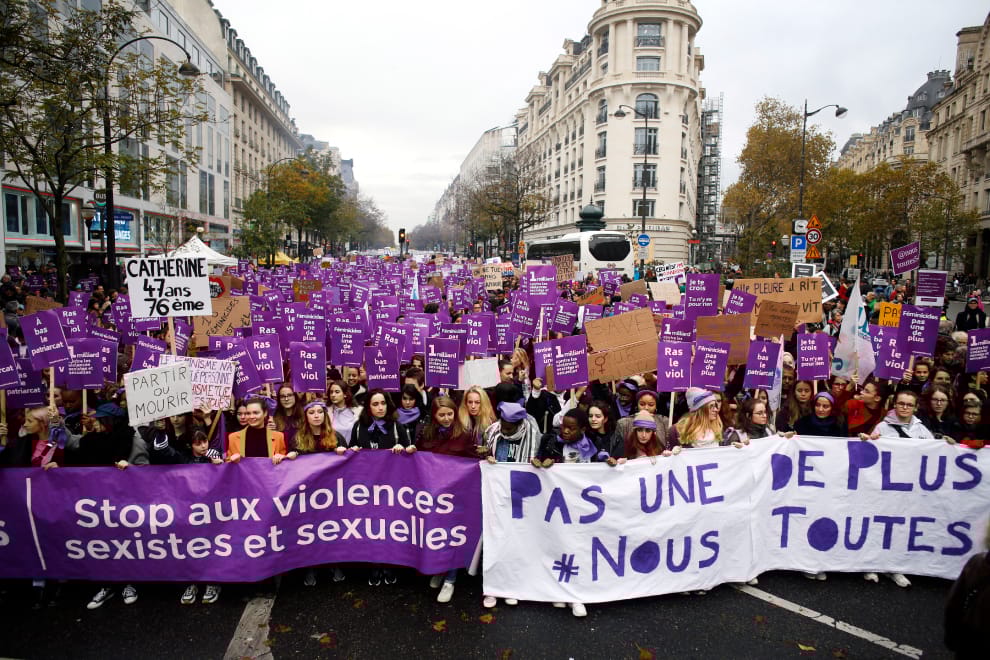 2019年11月23日,巴黎街頭出現大批抗議家暴的女性,她們手上舉的牌子寫有遭殺害的婦女姓名,左方的旗幟寫著「停止性暴力」,右方的旗幟寫著「不要再有下一個」。