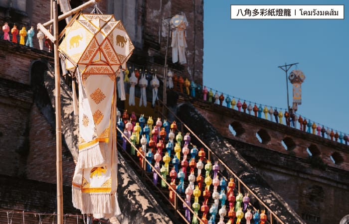 八角多彩紙燈籠是泰北街頭常見的裝飾,據說是自蘭納王國時期流傳下來,可以替人們求得下一世的福報。圖為八角紙燈籠,作者攝於清邁的佛寺中和清盛街頭上。