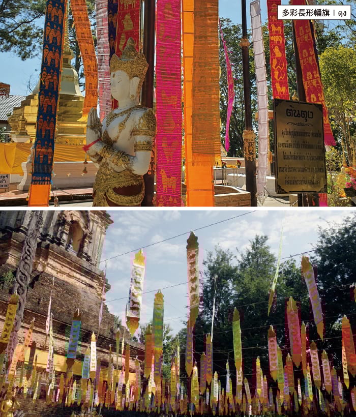 這些美麗的多彩長形幡旗,同樣也是自蘭納王國時期流傳下來的民俗,其目的也和八角燈籠相似,都是為了要積德求好運。