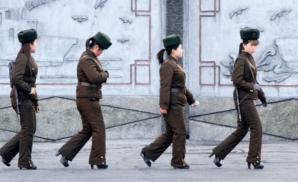 本照攝於北韓平壤,2018年9月9日,為慶祝北韓成立 70周年,畫面中的女性軍人正穿著黑色跟鞋參與閱兵典禮。