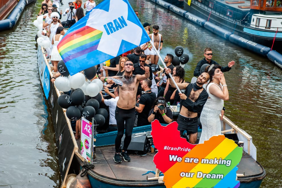 在伊朗保守的社會氛圍下,家族成員要是出櫃會被視作破壞家族名譽,有可能遭到「榮譽處決」。圖為 2019年8月在荷蘭阿姆斯特丹舉辦的同志大遊行,當時來自伊朗的同志舉著寫有「伊朗」字樣的彩虹旗幟共襄盛舉。