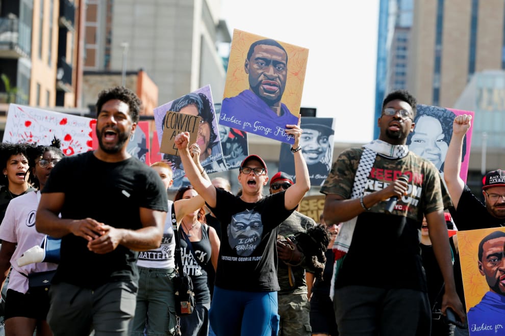 美國反警察恐怖計畫成員伯奇認為,在非裔男子佛洛伊德遭白人警察謀殺後,更加凸顯出民眾紀錄警方執法過程的重要性。圖為美國民眾在涉嫌殺害佛洛伊德的白人警察沙文(Derek Chauvin)刑期出爐時,再次帶著佛洛伊德肖像走上街頭。