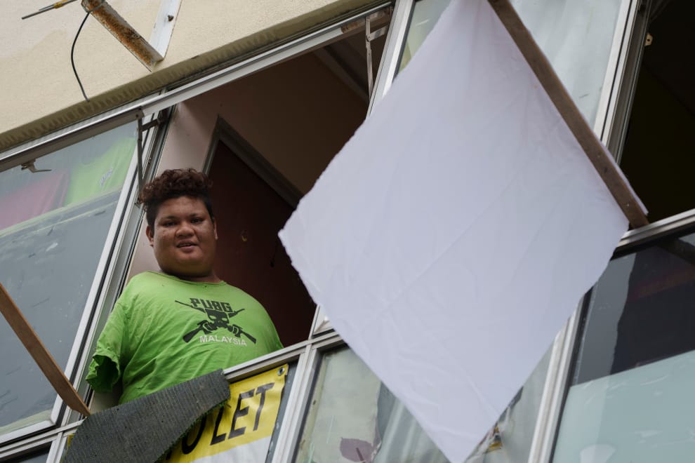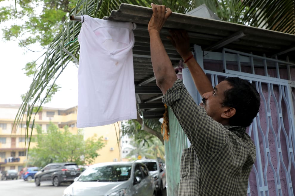 隨著白旗運動日漸蓬勃起來,許多馬來西亞的名人、企業也紛紛加入響應。圖為現年 45歲的洗車工薩西庫馬爾(Sasikumar),他在封城期間丟了工作,龐大的生活壓力讓他只得在屋外掛起白旗求援。