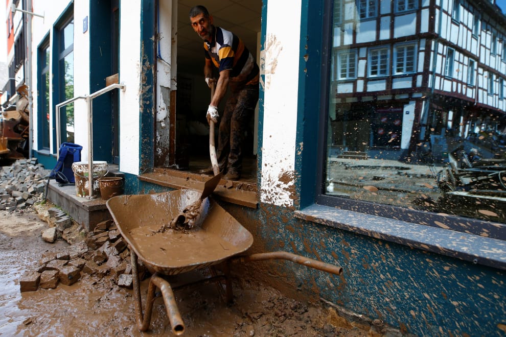 對受災的居民來說,梅克爾承諾的那筆補助很重要。圖為位於德國北萊茵-西伐利亞邦的巴特明斯特艾費爾鎮(Bad Münstereifel),一名男子從路邊一座屋子裡鏟岀污泥。