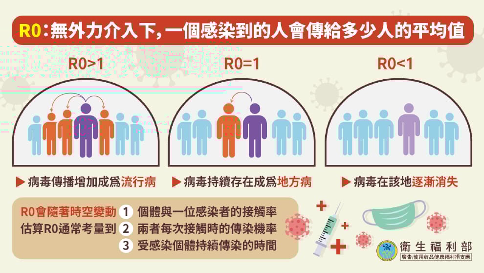 R0會隨著人與人的社交距離、病毒傳染力而有所變動,當多數人接種疫苗並落實戴口罩、勤洗手、保持社交距離等個人防疫措施時,R0就會下降,難以繼續流行。