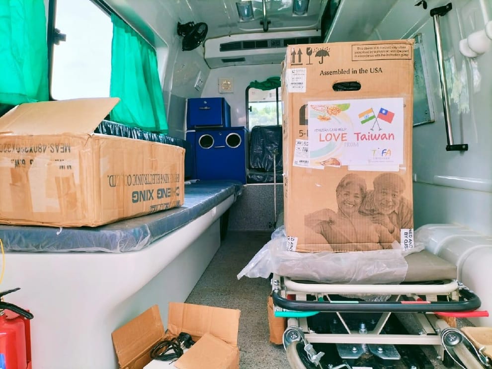 台灣印度友好協會(TIFA)捐贈的製氧機放置在菩提迦耶的救護車上,即時救援每一條寶貴的生命。照片提供 / 台灣印度友好協會 TIFA