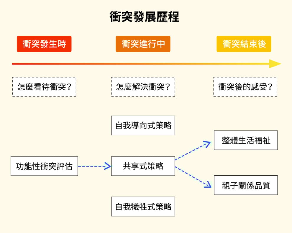 越常從「功能性觀點」來看待親子衝突的子女,越傾向採取「共享式策略」,他們在親子關係、個人幸福感都比較好。