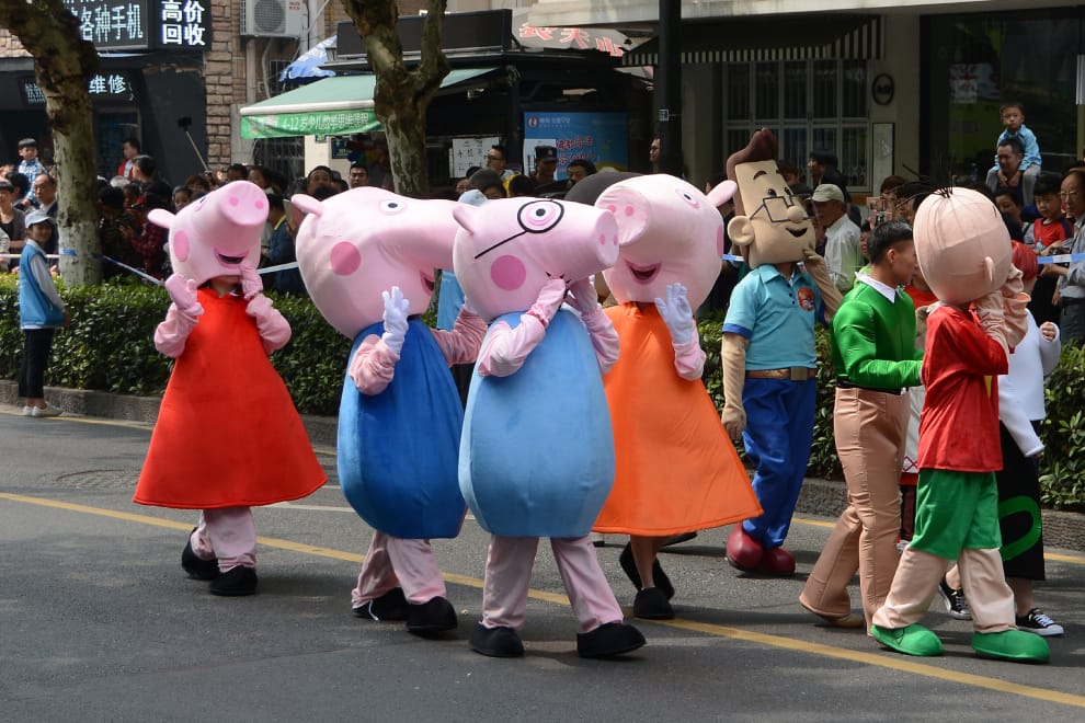 在封鎖期間,《佩佩豬》一躍成了美國廣受喜愛的熱門卡通。圖為在 2018年中國杭州舉辦的國際卡通動漫節上,一群民眾打扮成了《佩佩豬》的樣子在街上行走。