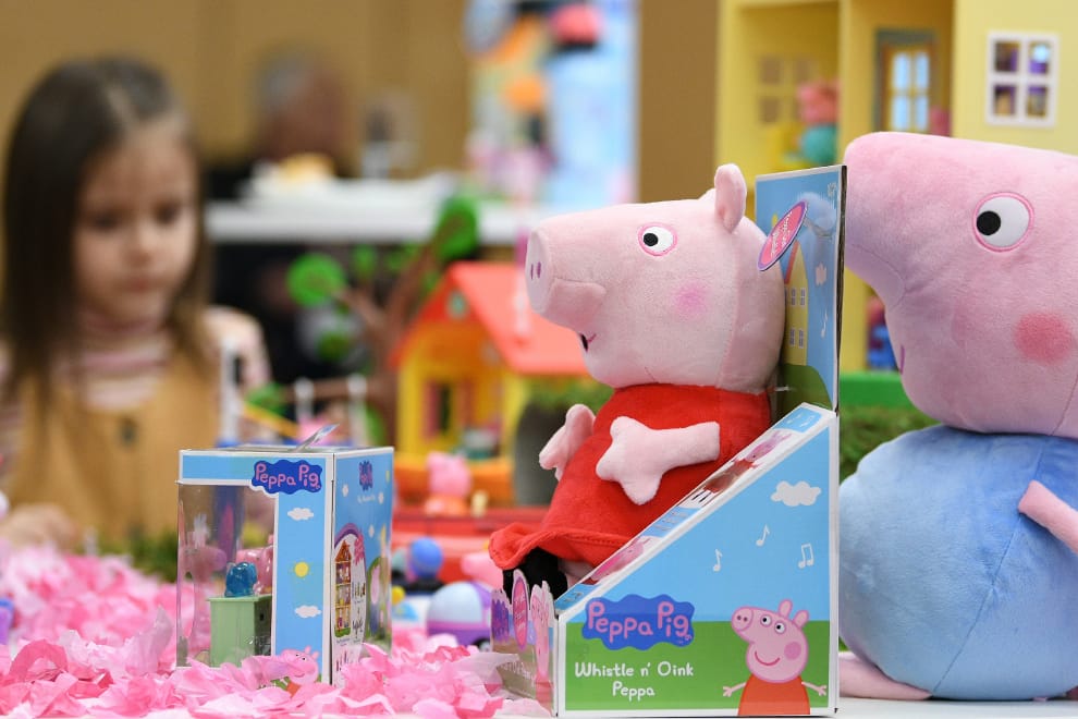 在美國封鎖期間,許多家長們選擇用播放卡通《佩佩豬》,讓自己有點餘裕做事。但《佩佩豬》看多的結果,就是讓部分孩子們的口音出現了改變。圖為在去年 1月的德國國際玩具展上展示的兩隻《佩佩豬》娃娃。