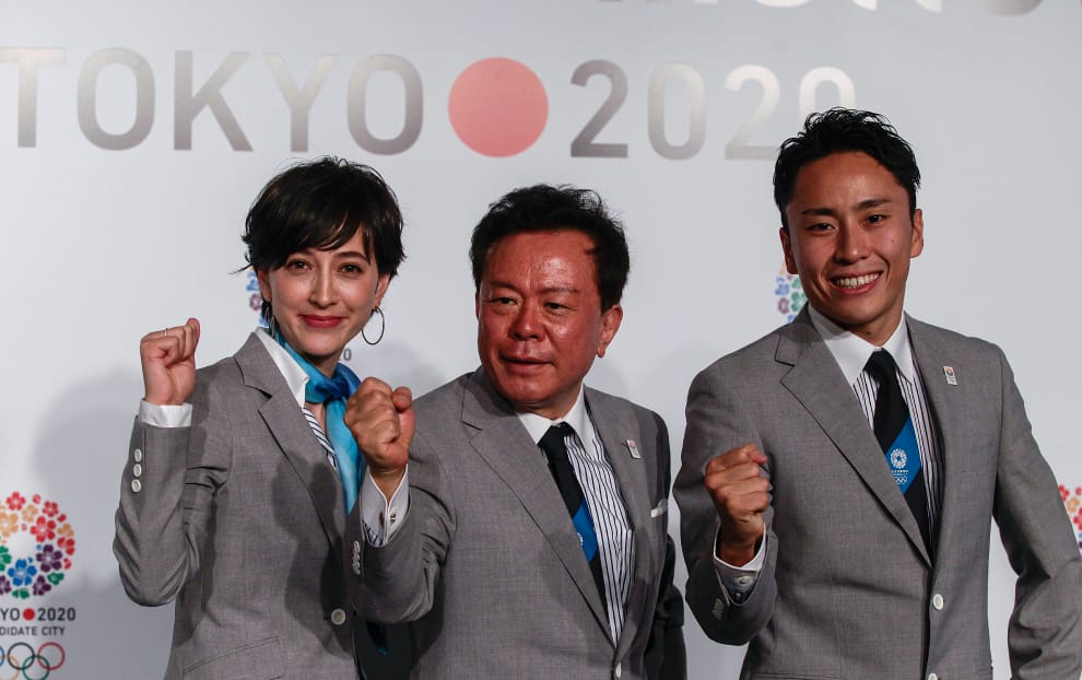 2013年,擁有法國血統的日本電視主播瀧川克莉絲汀(圖左)協助東京申請奧運,她的身旁站著時任東京都知事的豬瀨直樹(中)以及日本男子擊劍運動員太田雄貴(右)。