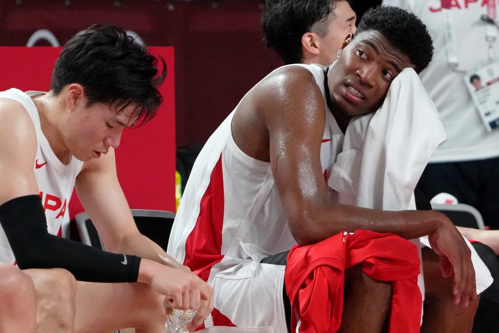 在東京奧運日本對上西班牙的籃球比賽上,日本選手八村壘一邊擦汗,一邊看著場中央。