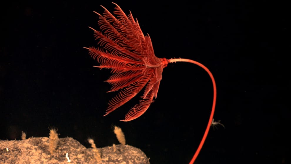 畫面為現代的海羊齒。海羊齒屬於海百合綱(Crinoidea)、櫛羽星目(Comatulida,又譯海羊齒目),俗稱「feather star」,通常生長在熱帶和溫帶水域的海床或珊瑚礁上。