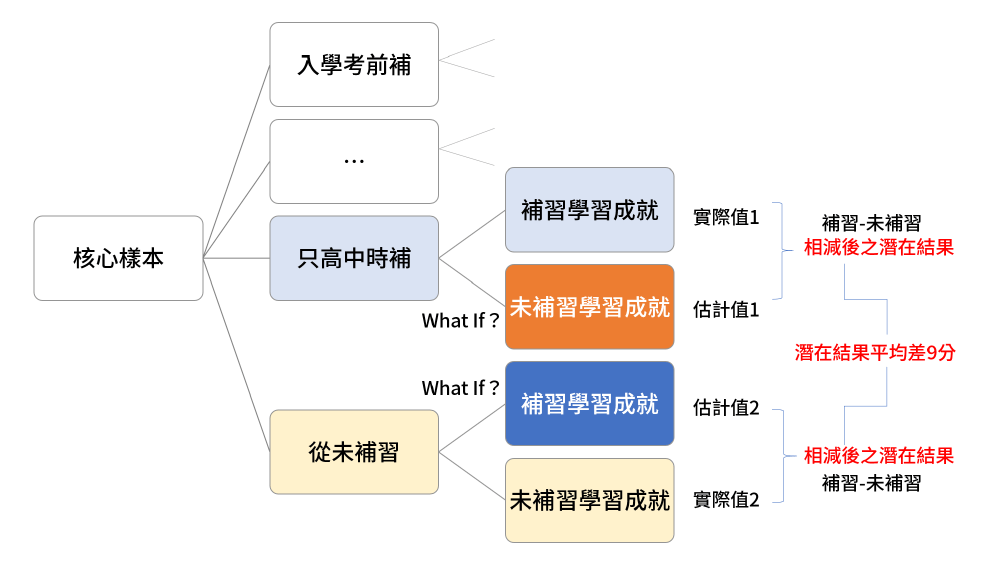 關秉寅透過反事實分析法研究補習是否學習成效較好。