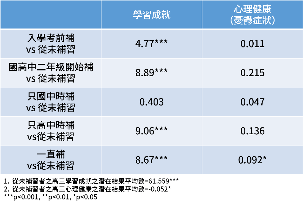 註1:此處的學習成效,也就是研究變項中的「學習成就」,統計採用臺灣教育長期追蹤資料庫提供的綜合能力測量,將項目反應理論(Item Response Theory,IRT)估計的標準分數轉換成百分制分數。