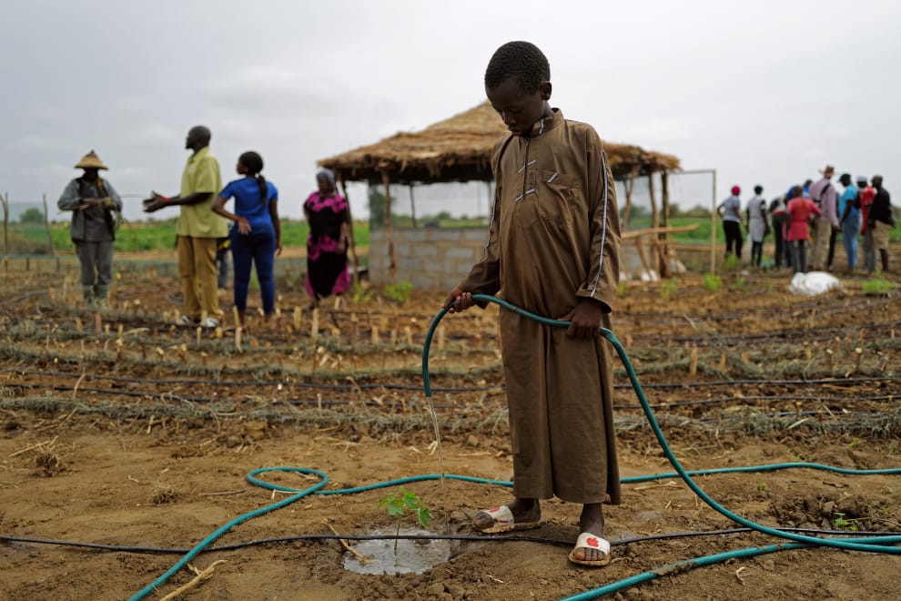 路透社 / 達志影像一名 11歲的男孩正在為環形花園「Tolou Keur」的新樹苗澆水。