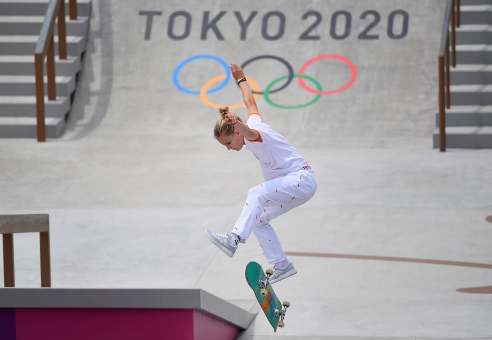 滑板是今年 2020東京奧運的新增比賽項目之一。畫面攝於 7月26日,為滑板女子街頭組的決賽,當中的參賽選手是代表荷蘭的茲威斯洛特(Roos Zwetsloot)。