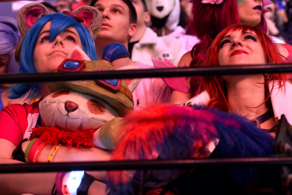 本照攝於 2019年的英雄聯盟世界大賽決賽(League of Legends World Championship Finals),畫面中,看台上的粉絲正聚精會神地盯著比賽畫面。