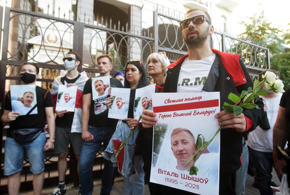 在位於基輔的白羅斯駐烏克蘭大使館前,流亡烏克蘭的白羅斯人士手拿席修夫的照片,悼念他離奇過世。
