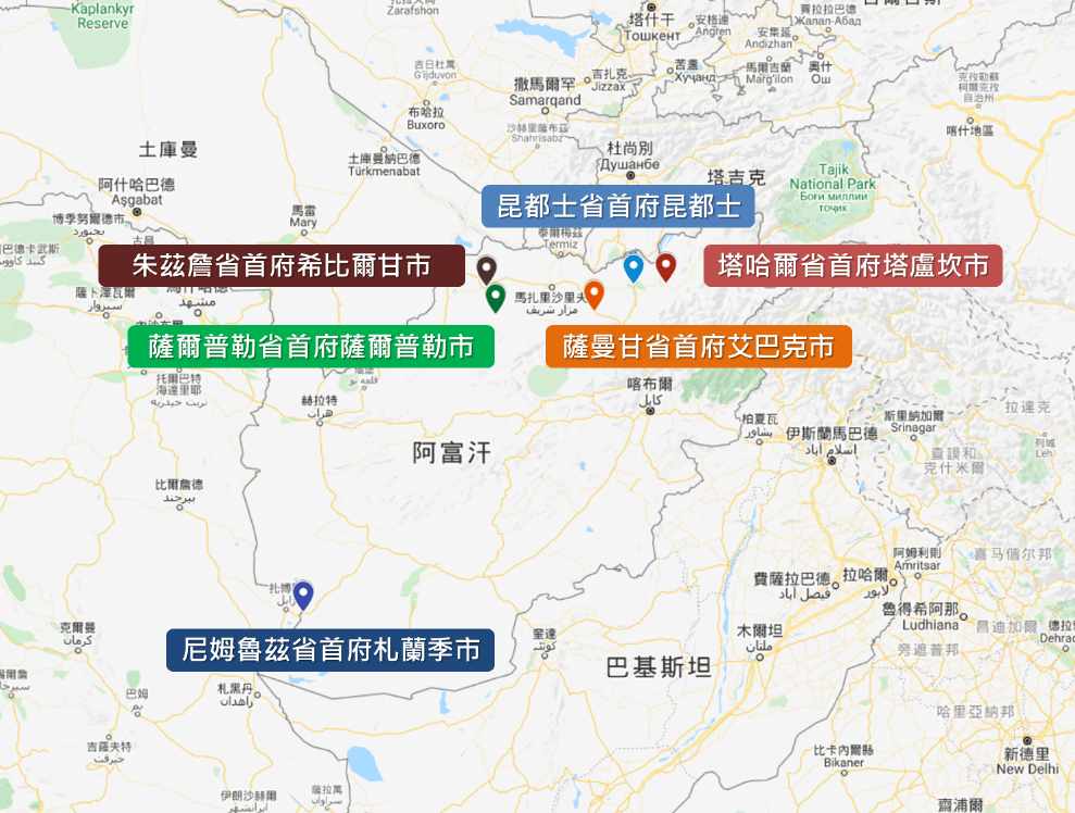 圖為上周末落入塔利班手中的各個省會地圖,其中除了尼姆魯茲省(Nimruz)首府札蘭季(Zaranj)以外,其他像是朱茲詹省(Jawzjan)首府希比爾甘市(Sheberghan)、薩爾普勒省(Sar-e Pol)首府薩爾普勒市、塔哈爾省(Takhar)首府塔盧坎市(Taleqan)、昆都士省首府昆都士,以及周一淪陷的薩曼甘省(Samangan)首府艾巴克市(Aibak)皆位於北部。