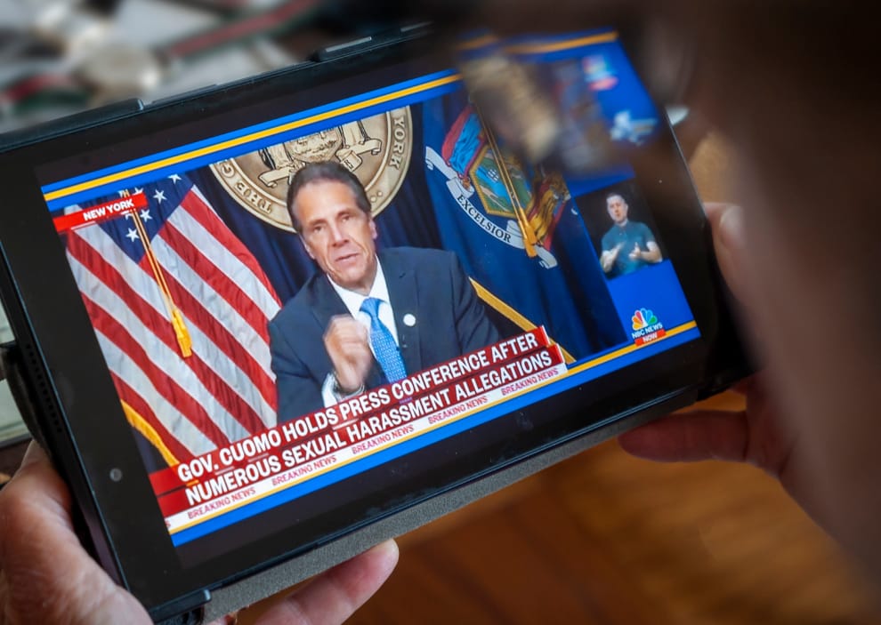 在記者會上,庫莫仍舊矢口否認這些性騷擾指控。圖為一名透過平板觀看庫莫辭職記者會的女子。