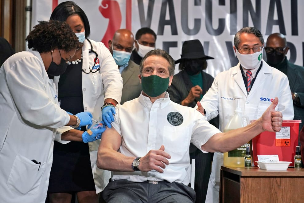 在防疫期間,庫莫和其執政團隊的成果使他在美國的知名度大增。圖為今年 3月,庫莫接種疫苗的畫面,照片中的他還對四周的媒體豎起大拇指。
