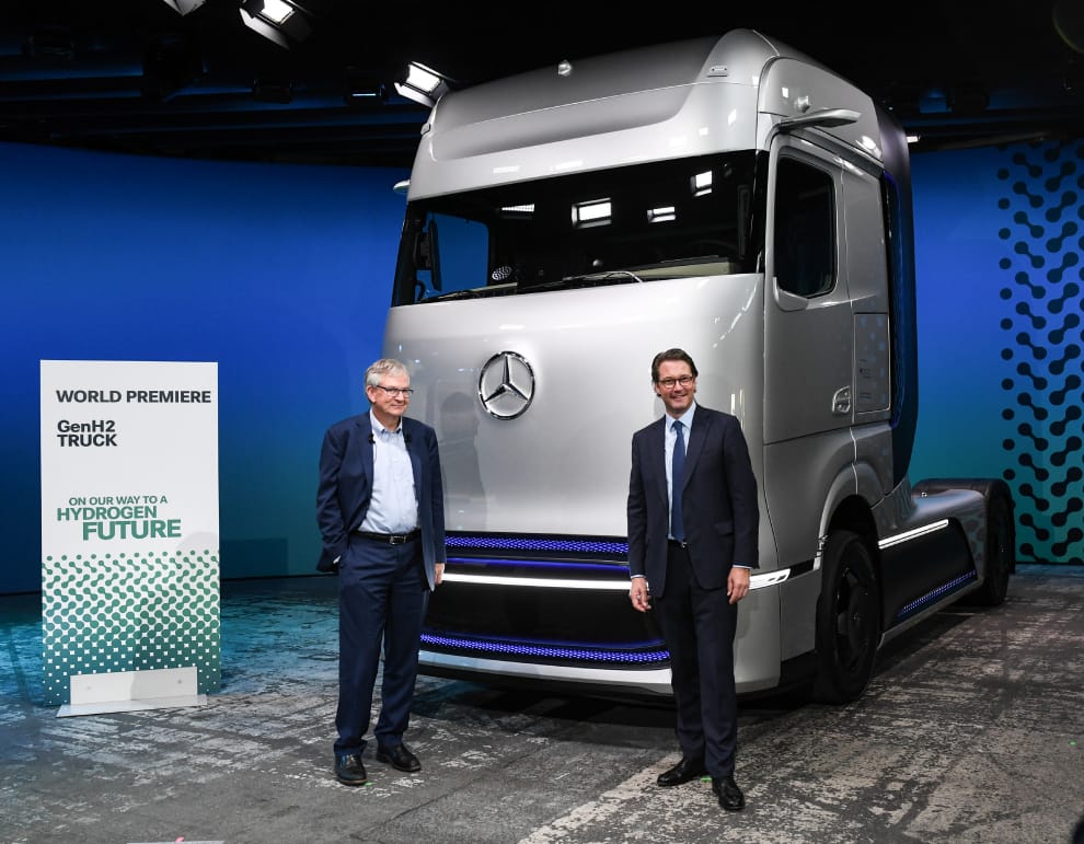 目前,全球各大廠商都加緊腳步,投入氫能應用的相關研發中。圖為 2020年戴姆勒卡車(Daimler Trucks and Busses)的董事道姆(Martin Daum,左),和時任德國運輸及交通基礎建設部長的休爾(Andreas Scheuer,右),一起在賓士新發表的GenH2氫能卡車原型車前合影。
